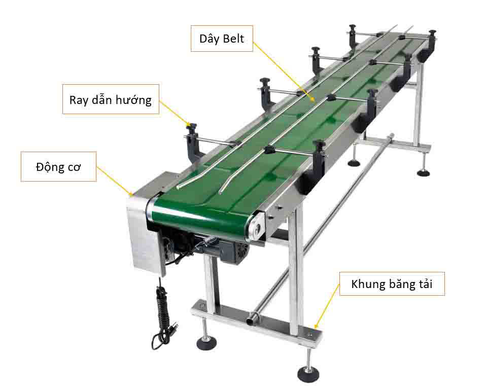 - Chân đế: Hỗ trợ khung băng tải và giữ cho băng tải ổn định khi hoạt động.